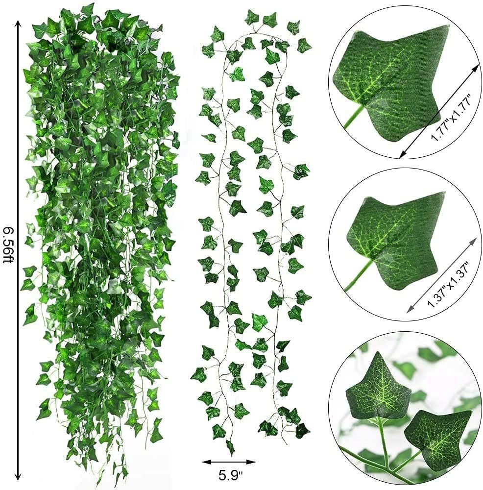 Set includes: ivy garlands Material: The artificial ivy leaves of our fake vines are made of silk and the stems are made of plastic. Specifications: Garland length: approx. 78.7 inches/2 meters each; large leaf size: approx. 4.5 cm x 4.5 cm/1.77' x 1.77'; small leaf size: approx. 3.5 cm x 3.5 cm / 1.37' x 1.37". Ideal Decoration: Our artificial ivy vines are made with exquisite dyeing technology; so they are vivid; not easy to fade and durable. Suitable for indoor and outdoor decoration in gardens; swings; balconies; bedrooms; wall hangings; birthdays; banquets; weddings; etc. With the green nylon cable ties; it can be easily fixed on shelves; lattices; fences and walls. Note: It is normal that the leaves may have slight odor; and they are non-toxic and harmless; and the smell will disappear after being placed in a ventilated environment for a while. During the packaging or transportation process; some leaves may fall off the garland; and you only need to install them manually and this does not affect your normal use.