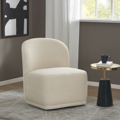 The Madison Park Irene Armless Swivel Chair offers a modern sophisticated update to your living room. Upholstered in an ivory faux boucle fabric, this swivel chair flaunts a rounded design and curved back to create a chic minimalistic profile. The hidden swivel base allows the chair to fully rotate 360 degrees. Perfect for small spaces, this swivel chair brings an inviting look and cozy comfort to your home decor. Ready right out of the box! No assembly is required.