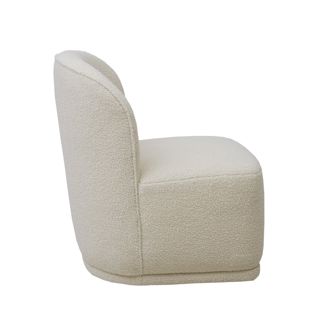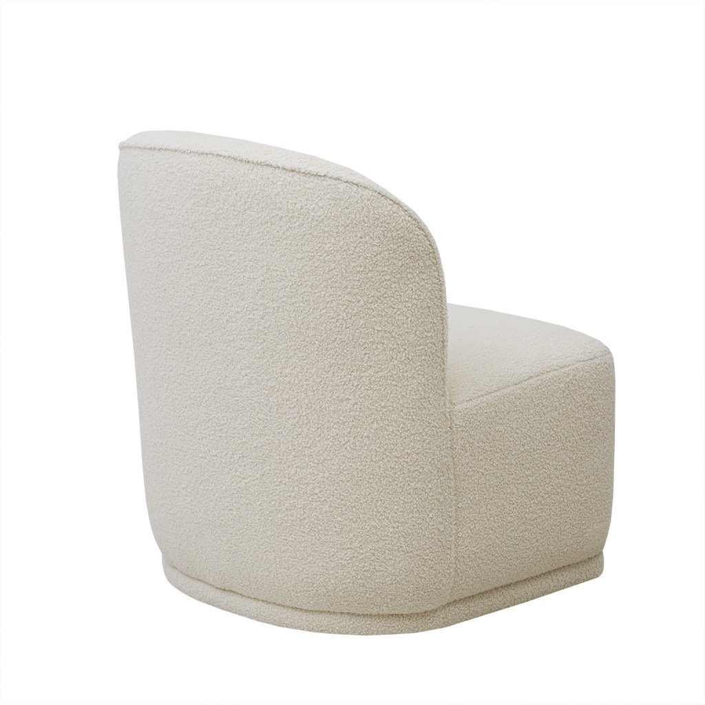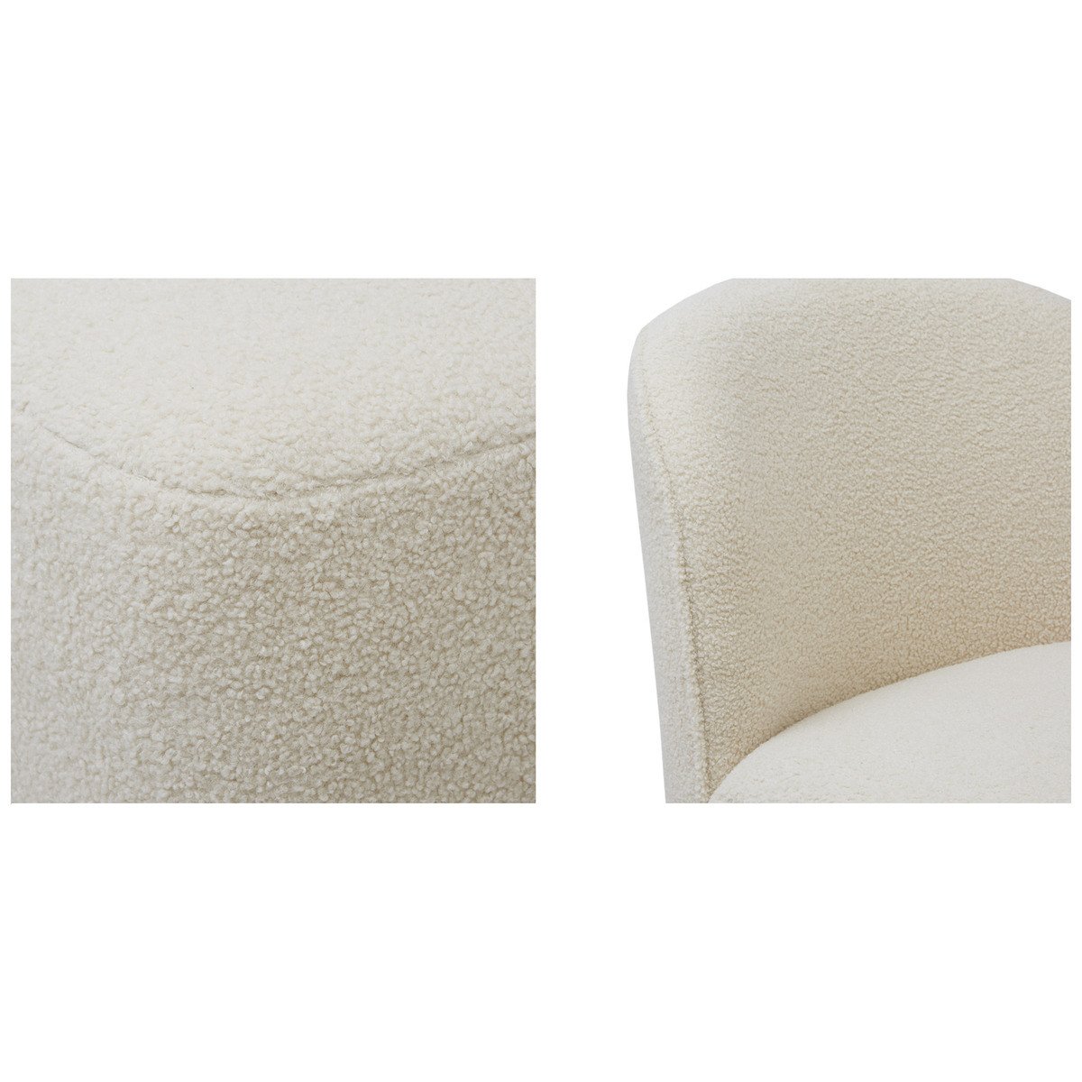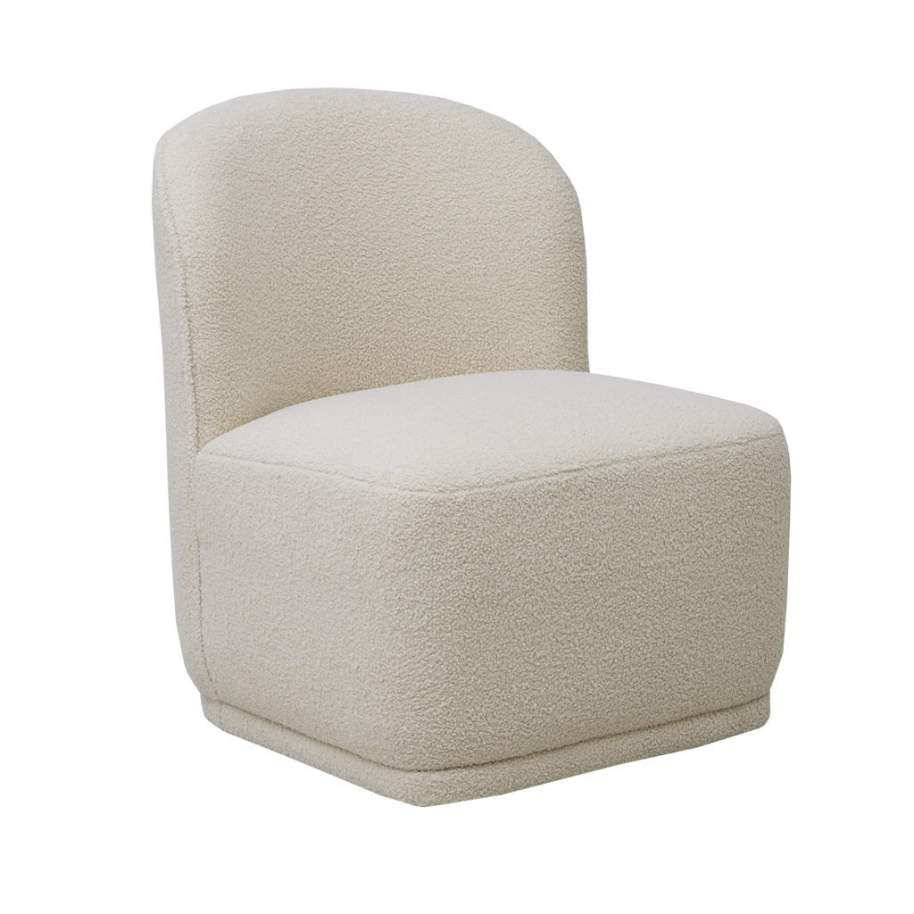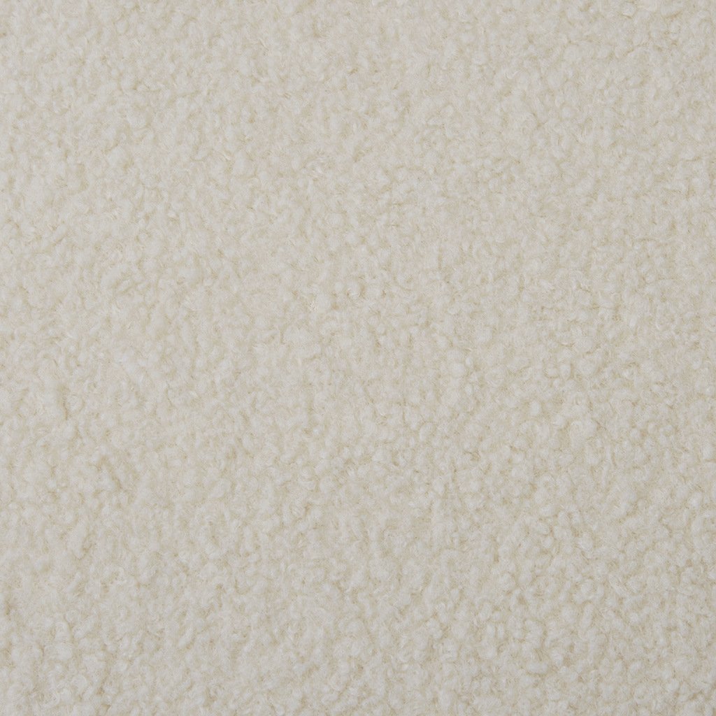 Fully upholstered in an ivory, faux boucle fabric is inviting, cozy and on-trend