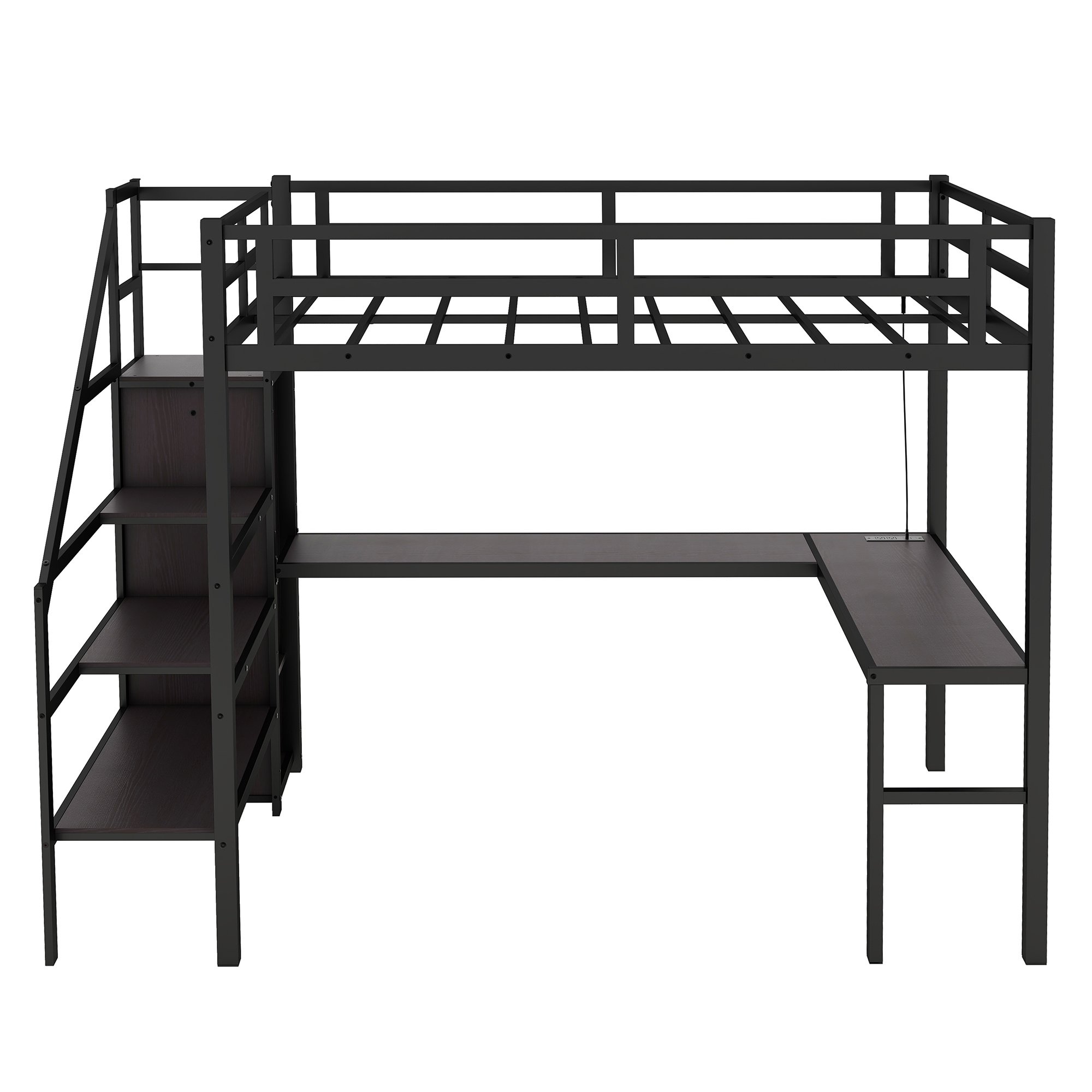 Full Size Loft Bed with L-shaped Desk and USB, Metal Loft Bed with Wardrobe and Adjustable Shelf, High Loft Bed with LED for Kids Teens Adults, Black