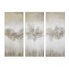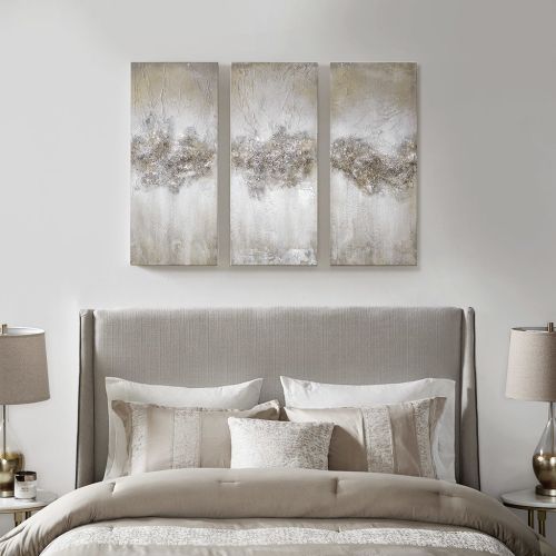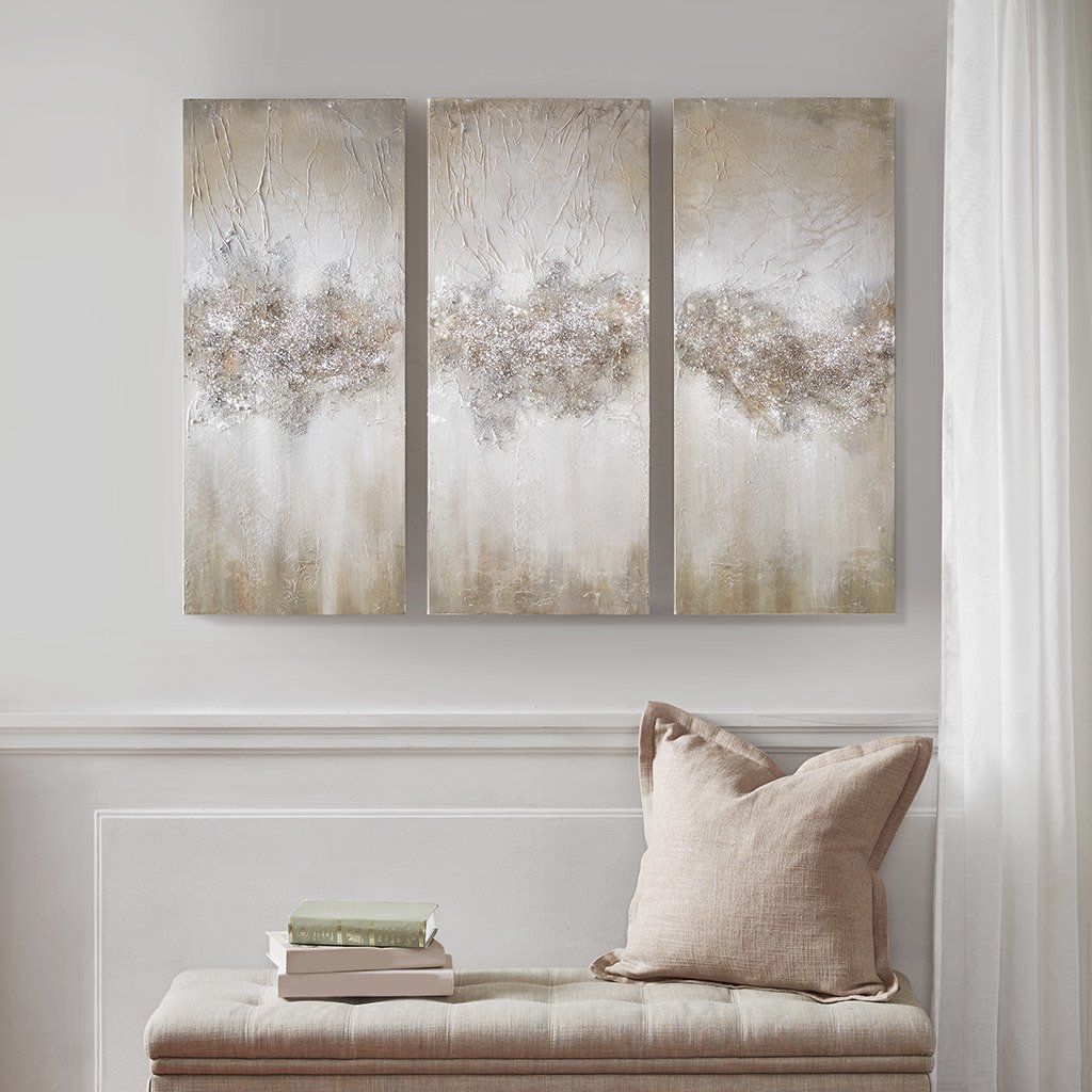 Accent your space with the contemporary allure of our Madison Park Luminous Heavily Embellished 3-piece Canvas Wall Art Set. 100% hand-painted, this canvas wall art set showcases rich natural and taupe ascending shades to create a warm ombre abstract look. Natural rock and stone embellishment on each canvas create beautiful texture and dimension, while a glitter finish adds a rich sheen and luster. Each piece measures 15x35" and also features 2 D-rings on reverse making it easy to hang, while an MDF backing provides additional support and structure. Hang this three piece hand-painted canvas set in your living room, dining room, or entry way to bring a chic modern sparkle to any space. Due to hand embellishment of natural rock and stone; colors and glitz may vary slightly from image making each piece unique.