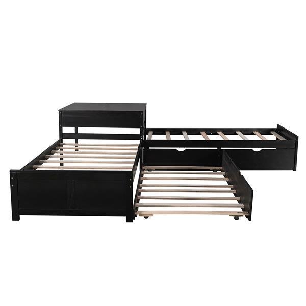 Full Size Daybed with Support LegsAre you finding a bed or sofa to sleep or have rest in leisure time? Our dual-use daybed frame can be used as sofa or bed. It is a good choice for you. High-quality, solid pine legs and a strong, durable frame ensures stability and durability for long-term use. Slat kit included so box springs are not required. This daybed is designed with a clean silhouette and a hue of elegance. It suits all styles of home decoration, and completes the look of any bedroom.Weight & DimensionsOverall Product Dimension78.2"L x 55.3"W x 35.4"HNumber of Package1Overall Product Weight61.24LBSWeight Capacity350LBSRecommended Mattress Thickness6"SpecificationsProduct TypeDaybedSizeFullColorWhite/EspressoMaterialPlywood+MDF+PinewoodNumber of Slats10Country of OriginVietnamNotesManual measurement has been used,there may be some reasonable error. All the pictures are taken by actual samples, slight chromatic aberration may occur due to lighting or display.[3 Beds in 1] This L shaped bunk bed features 3 beds,the twin corner platform bed is perfect for families who have several members, and more,you can also accomodate overnight friends of yours,perfect for limited space.[Built-in Table and Drawers Storage] Our L-shaped platform bed frame is equipped with a built-in table which can be used as an oversize nightstand with more space and more weight capability.And two drawers under the bed can store daily necessities such as toys or books. They can meet your different needs.[Sturdy Construction] Constructed of solid pine wood+MDF, this L-shaped platform bed features a sturdy high quality solid wood construction for durability and high load capacity, ensuring longevity.[Convertible Trundle and Drawers] The trundle and the two drawers are convertible, both of them can be put left or right.[Easy Assembly] Each order comes with a clear and detailed assembly instruction guide and all necessary tools are provided to get your bed assembled in no time.