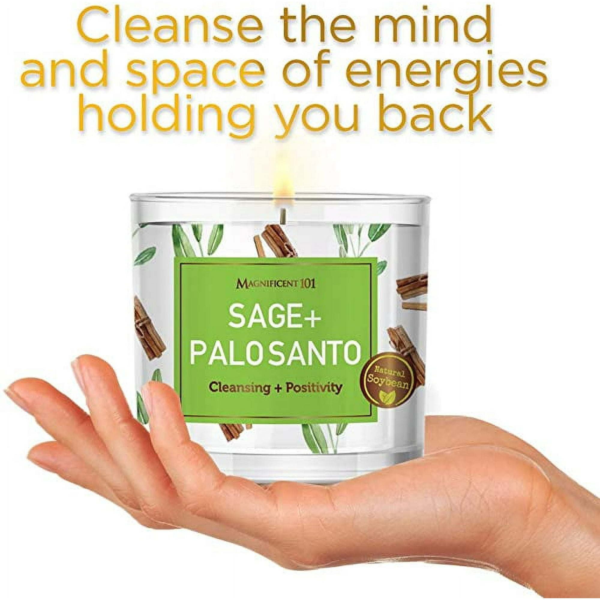 14 OZ NATURAL WHITE SAGE & PALO SANTO CANDLE FOR AROMATHERAPY − Made of Soybean Wax. This blend of earthy sage and palo santo creates a natural harmony in the home and body. Perfect to smudge away negative energies and set a new intention. Fill in the blank with your intention! Love, light, and positive energy goes into every candle. * SMUDGE AWAY NEGATIVE ENERGIES − Smudging is a cleansing ceremony that involves burning white sage in a manner that fills the home with the fragrance of the smoke. It is used to clear negative energy from people, places, or even objects and can be done as often as needed. Research shows that thujone, found in sage, is mildly psychoactive and enhances intuition. * CLARITY FOR INTENTION SETTING − Start your smudging ritual by decluttering your home and taking the time to think about your intention. It should be something you would like for your home or space, something meaningful for you. Choosing to sit and let go of negative thoughts in a ritual like this improves your mental clarity, allowing you to set a genuine intention for yourself. * HOME ENERGY CLEANSING − It’s a good idea to have a door or window open while smudging. The negative energy and negativity have to have someplace to go! * VIBRATION RAISING − Sage can do wonders to increase relaxation and reduce stress because it’s filled with negative ions, directly linked to an improved sense of well-being. * CHAKRA HEALING − The Latin word for sage salvia stems from the word heal. It's devoted to clearing, protection, and blessings. The use of sage can be traced back nearly 2,000 years to Indigenous Americans and shamans, who used it to release or cleanse negative energy from conflicted, angry or sick people. This healing candle was produced for smudging, purification, stress relief, anxiety soothing and ultimately providing an energy boost.