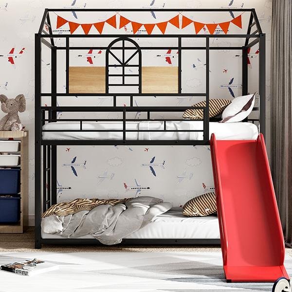 Home > Metal Bunk Bed ,Metal Housebed With Slide,Three Colors Available.(Black with Red Slide)