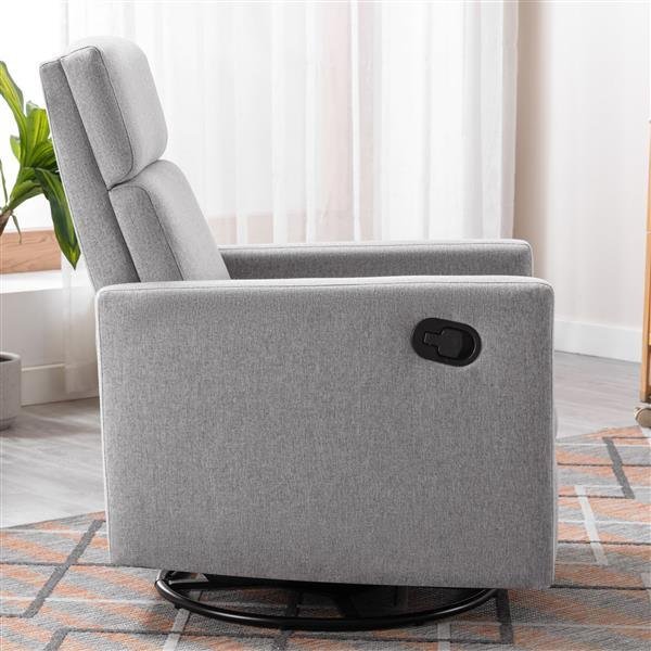 SpecificationsFinishUV paintingAssemble required60 minsPackage cartons1 pcProduct load-bearing30 poundsPacking details5-ply brown carton with 6 sides foam protect inside.Our product has passed the dropping test according international standard.Country of originalChinaAssemble requiredYes. And there are all parts, hardware&screw bag and paper instructions in the package.TipsUsing an electric drill for installation can be more labor-saving, but it is important to position the board in advance and drive the screws accurately.NoticeItems may slightly different from photo in terms of color due to the lighting during photo shooting or the monitor's display. Attention please !!! Improper use of screws may cause the pro duct surface damage! Please be careful when installing.MODERN DESIGN:With its tall back and stylish looks, it has the clean lines and square arms, the Rocking Recliner brings together the best of both worlds. When you're not reclining, it's a relaxing rocker with a smooth, graceful motion.COMFORTABLE & STURDY:This swivel recliner is composed of comfortable and soft fabrics with high-density soft foam padded seat and back, which perfectly wraps your body and brings you the ultimate comfort. Sturdy metal construction with a swivel base and solid wood frame ensures the recliner chair can hold more weight, and durable enough to function properly for years.MULTHIFUCTIONAL:This contemporary swivel push-back recliner is able to tilt from 95° to 16 °, providing you with the best angle of comfort, not only for working and reading, but also for napping and sleeping. The recliner supports 36 ° rotating gliding ability to provide you with fun in your life.SUITABLE FOR MORE STYLES:With multiple color choices, the Nursery Glider Swivel Rocker Chair is deigned to naturally move from the nursery to the living room, master bedroom, or any other room that needs a cozy spot to relax.EASY ASSEMBLY :It's easy to assemble this chair when you open the box, just need 1 minutes to assemble. If you have any questions, please contact us freely, we are glad to help you solve it.