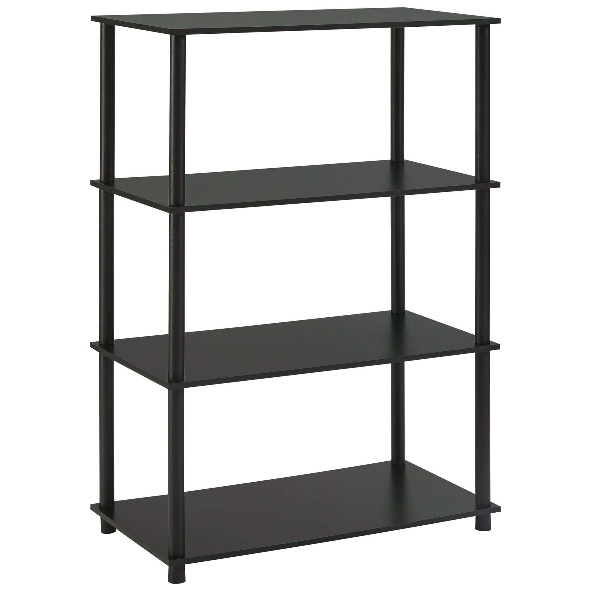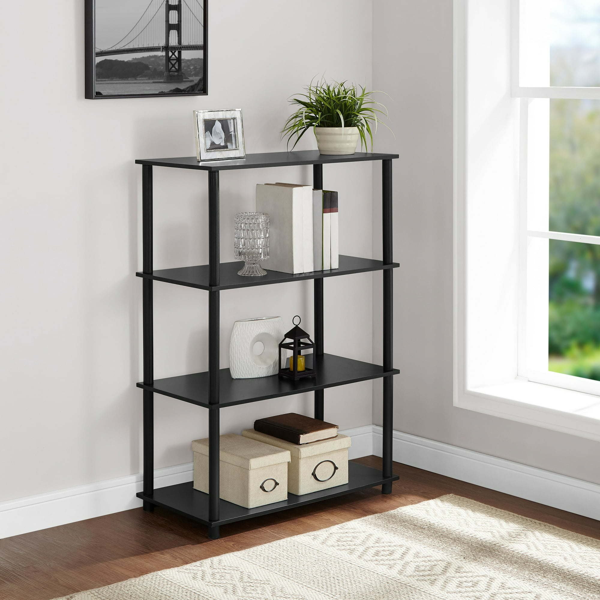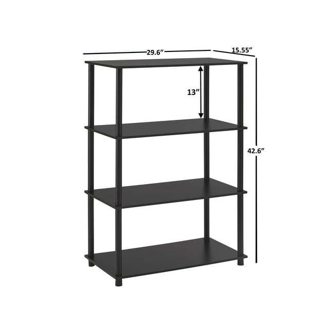 Get organized in style with No Tools 4-Shelf Storage Bookcase. This bookshelf has a modern design and is available in a variety of finishes to match almost any taste. Assembly is easily completed by just one person in minutes, with no tools needed. This attractive shelving system provides a welcome storage option for any living room, family room, den, or anywhere else extra organization is needed. Featuring an open-back design and sturdy frame, this storage unit can hold up to 22 pounds on the bottom shelf and 15 pounds on each additional shelf. Use it as a bookcase, plant stand, display shelf for photography and collectibles, or to store almost any item needed quickly and conveniently. The No Tools 4-Shelf Storage Bookcase stands over 42 inches tall and is ideal for medium and large rooms where smart, efficient storage is needed. The design provides over a foot of storage height between shelves and easily accommodates 6  cube storage bins (sold separately) to make the most of your storage space.