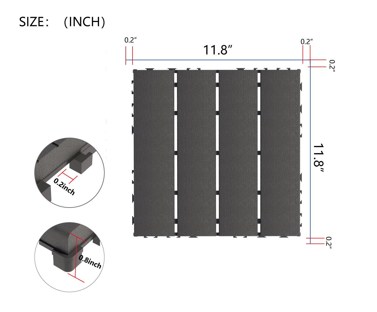 1. 2024 latest four styles of flooring in two colors 2. Easy to install or cuttable, no screws, drills, etc. --- easy DIY splicing project 3. Perfect for interlocking patio tiles, balcony tiles, bathrooms and any indoor or outdoor environment , these interlocking tiles are thin enough to not block the door and can fit any room as required 4. Environmentally friendly PP polypropylene material, thickened and tough material, strong and durable, stable structure, good load-bearing capacity 5. The floor is like a puzzle piece Each surface can be easily spliced ​​at will, no need to distinguish directions, and construction and installation can be quick.Sturdy and durable, they won't slip no matter what surface you put them on. 6. Multiple combinations to create various textures and patterns. You can play whatever you want. 7. 1 square foot per floor, 44 per set slices, large quantity Actual length 11.8 inches, splicing interface 0.2 inches