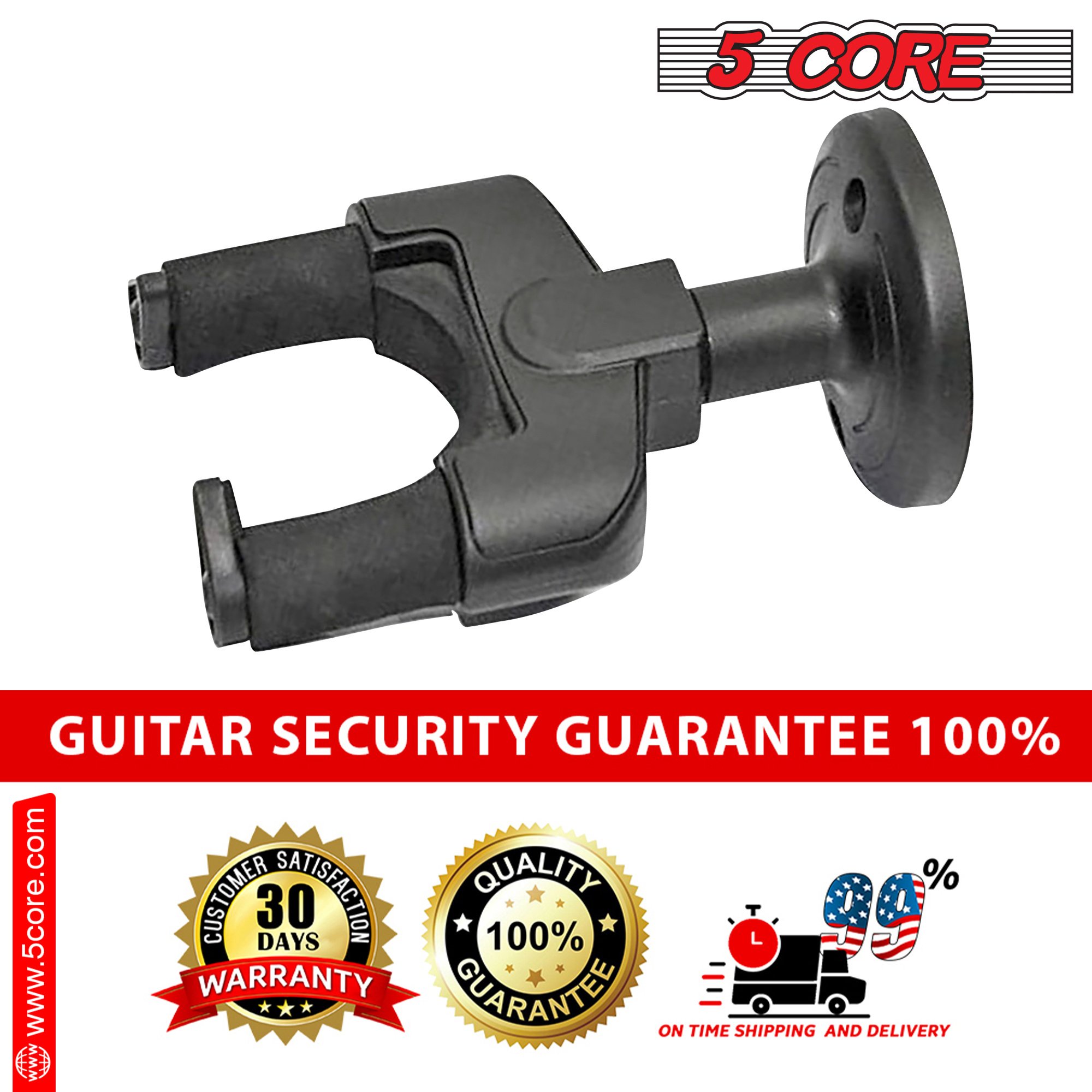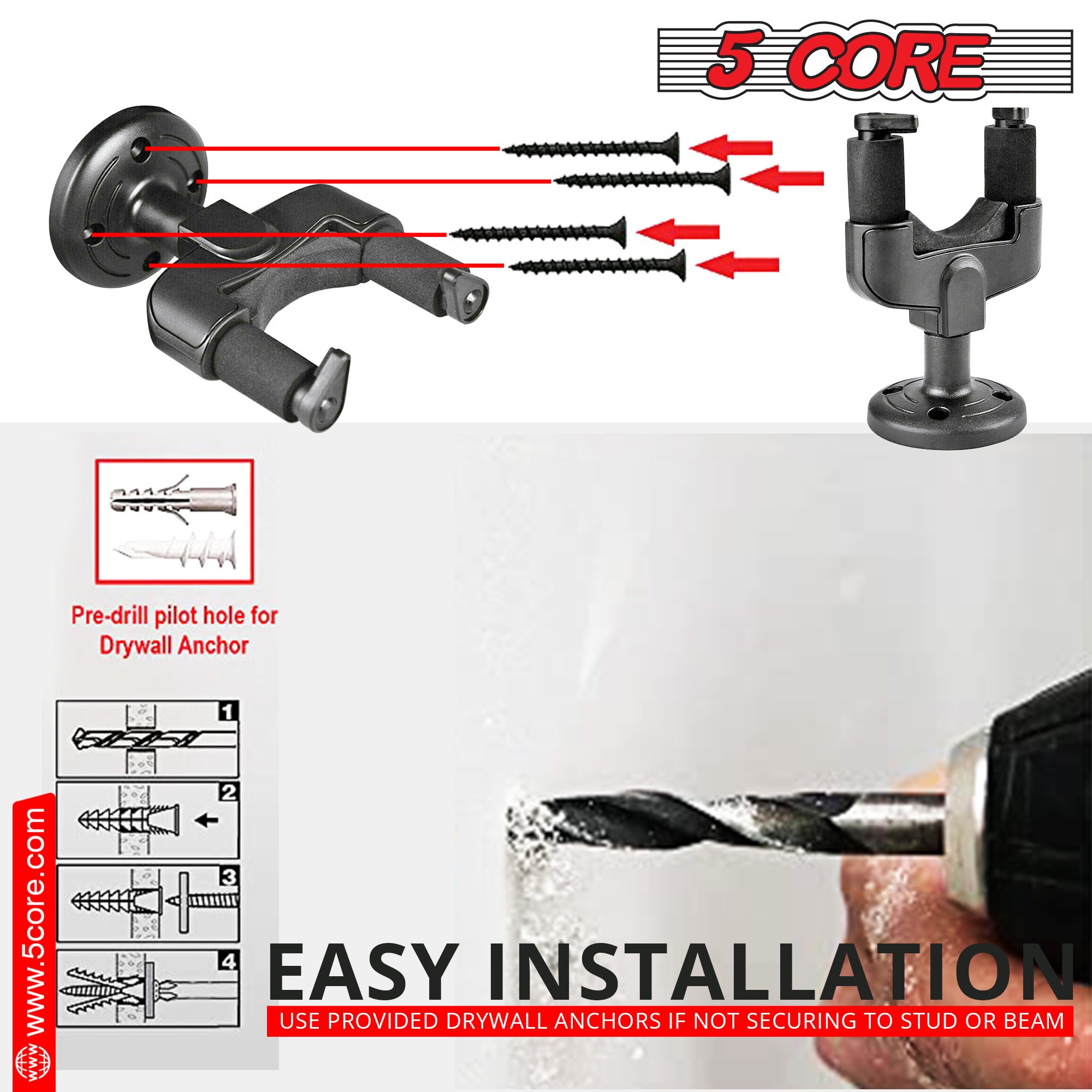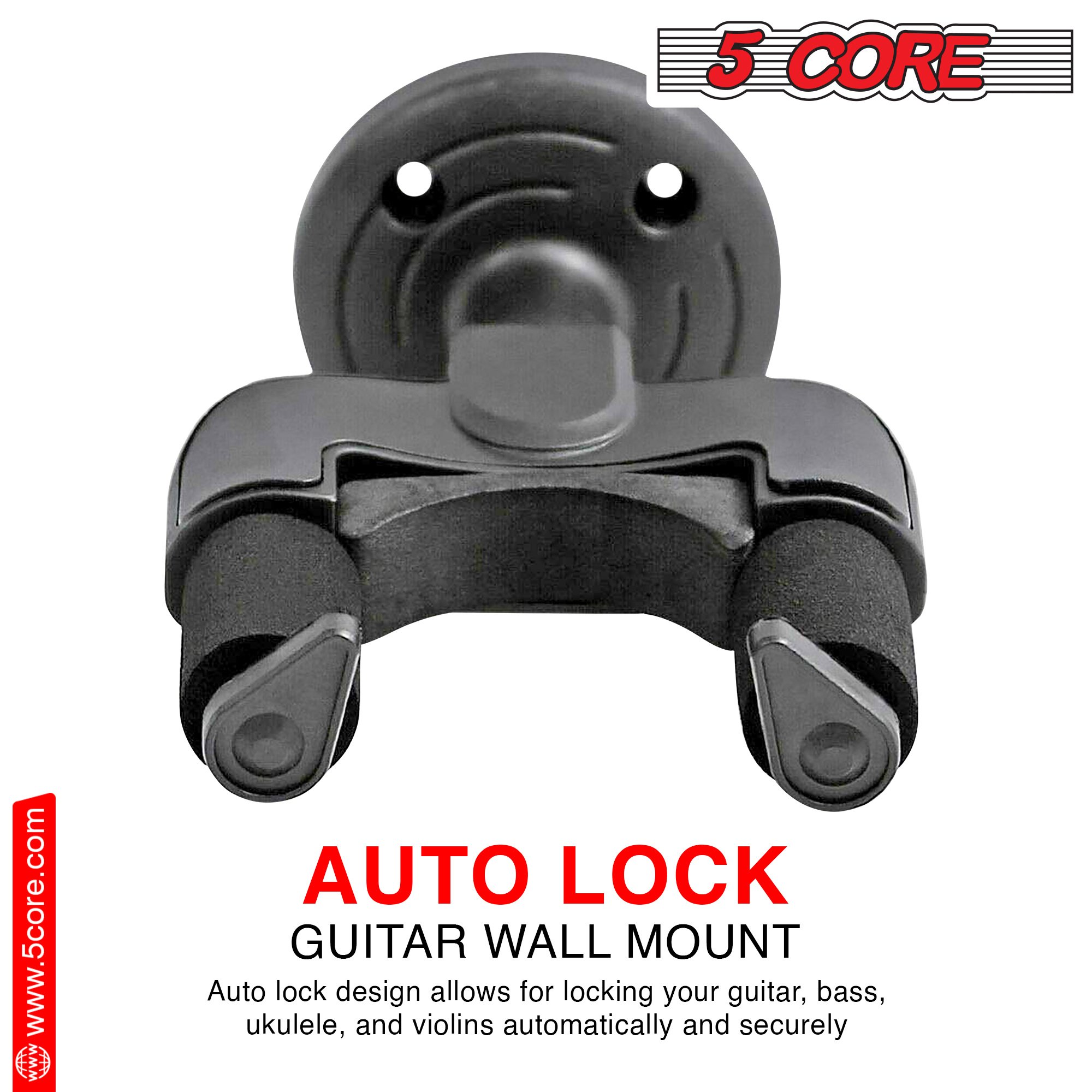 The high-density foam covering on this guitar wall mount protects your instrument’s finish from scratches or slipping; making it a convenient choice for transporting your guitar. | The 5 Core guitar wall hangers feature a screw-type anchor and a durable cradle; able to support even heavy guitars easily. | With the wall-mounted design of this wall guitar hanger; you can keep your guitar safe from curious pets and tidy use your space. Show off your beautiful instrument with pride to your friends and family. | Designed to work with all types of headstocks; the 5 Core guitar hanger is truly Universal; working with acoustic; electric; or bass guitar; violin; mandolin; and ukulele. |