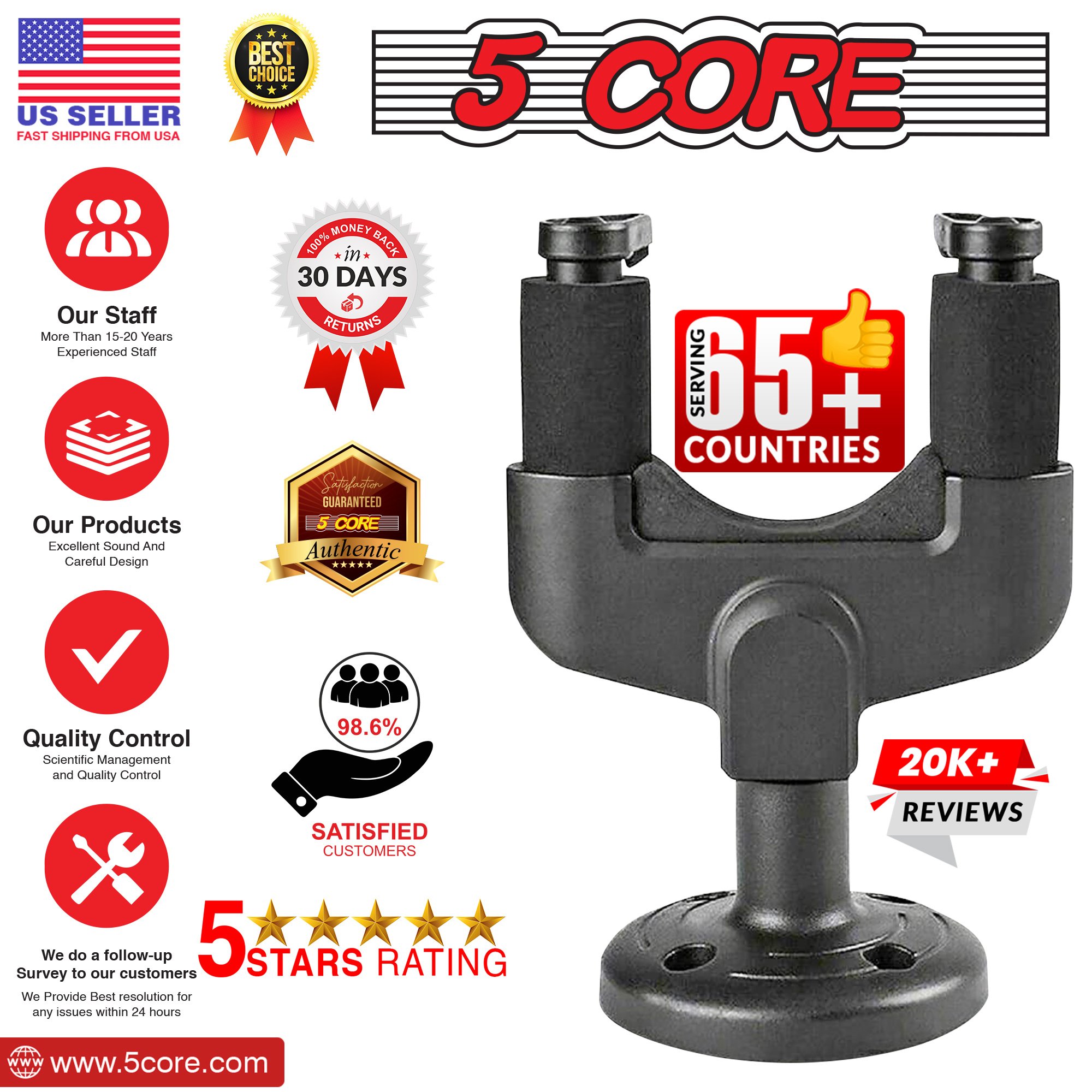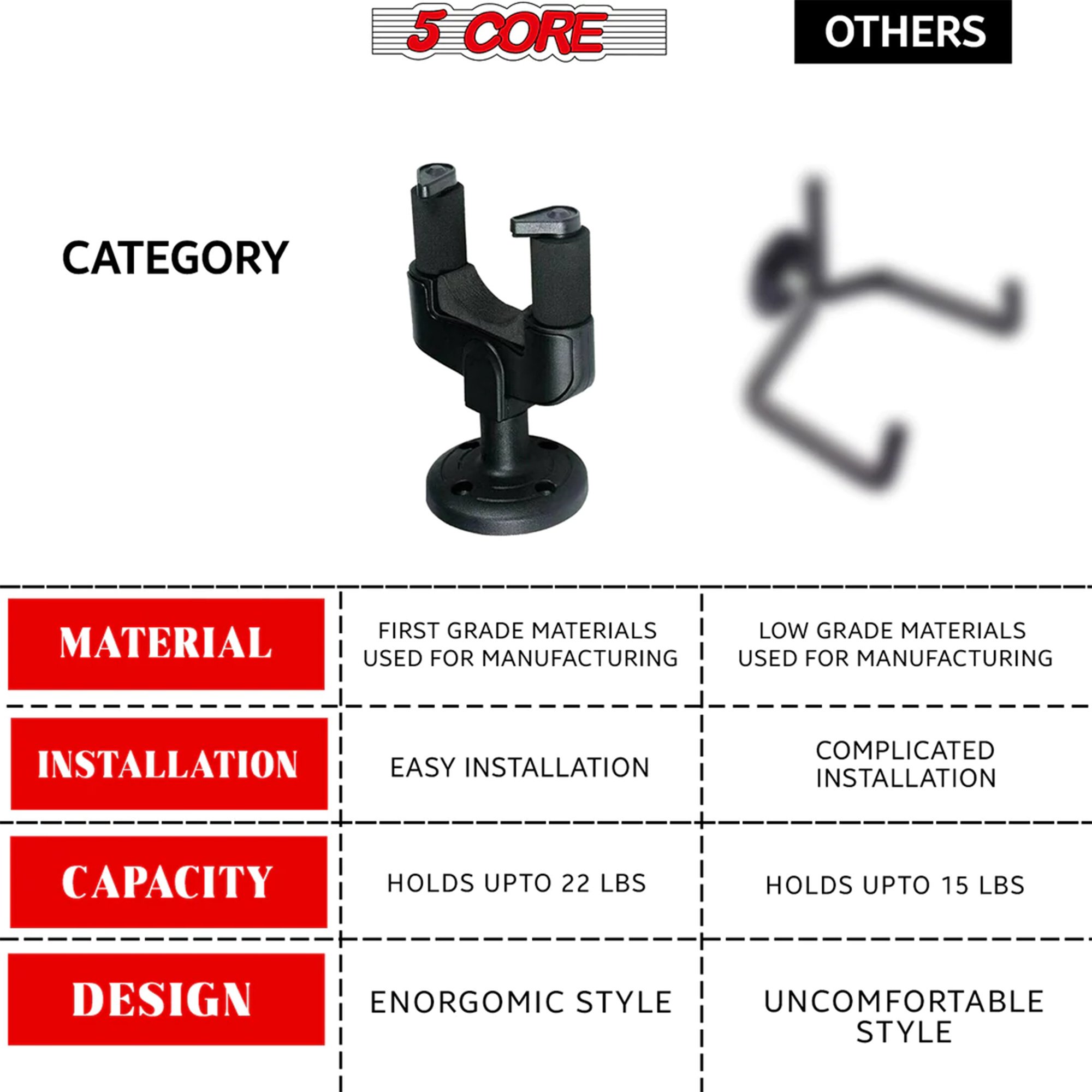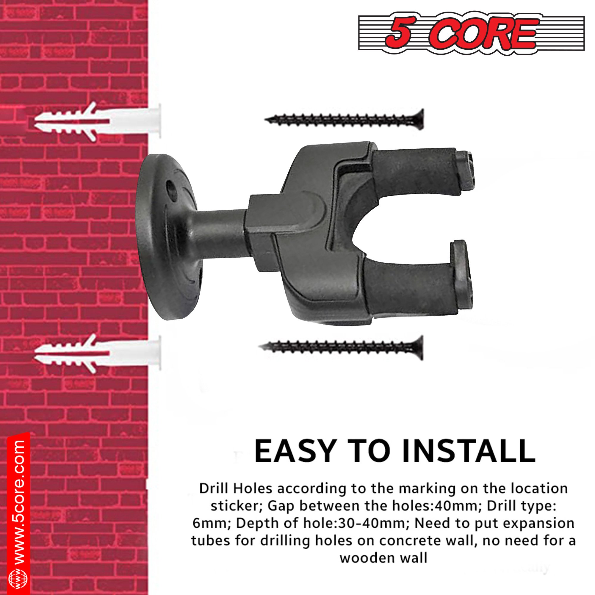 The high-density foam covering on this guitar wall mount protects your instrument’s finish from scratches or slipping; making it a convenient choice for transporting your guitar. | The 5 Core guitar wall hangers feature a screw-type anchor and a durable cradle; able to support even heavy guitars easily. | With the wall-mounted design of this wall guitar hanger; you can keep your guitar safe from curious pets and tidy use your space. Show off your beautiful instrument with pride to your friends and family. | Designed to work with all types of headstocks; the 5 Core guitar hanger is truly Universal; working with acoustic; electric; or bass guitar; violin; mandolin; and ukulele. |