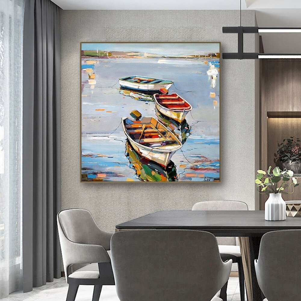 Hand Painted Oil Painting Canoe oil Paintings Nordic Seascape-Hand-Painted- Colorful Boats Oil Painting-Wall Art Handmade- For Home Decoration