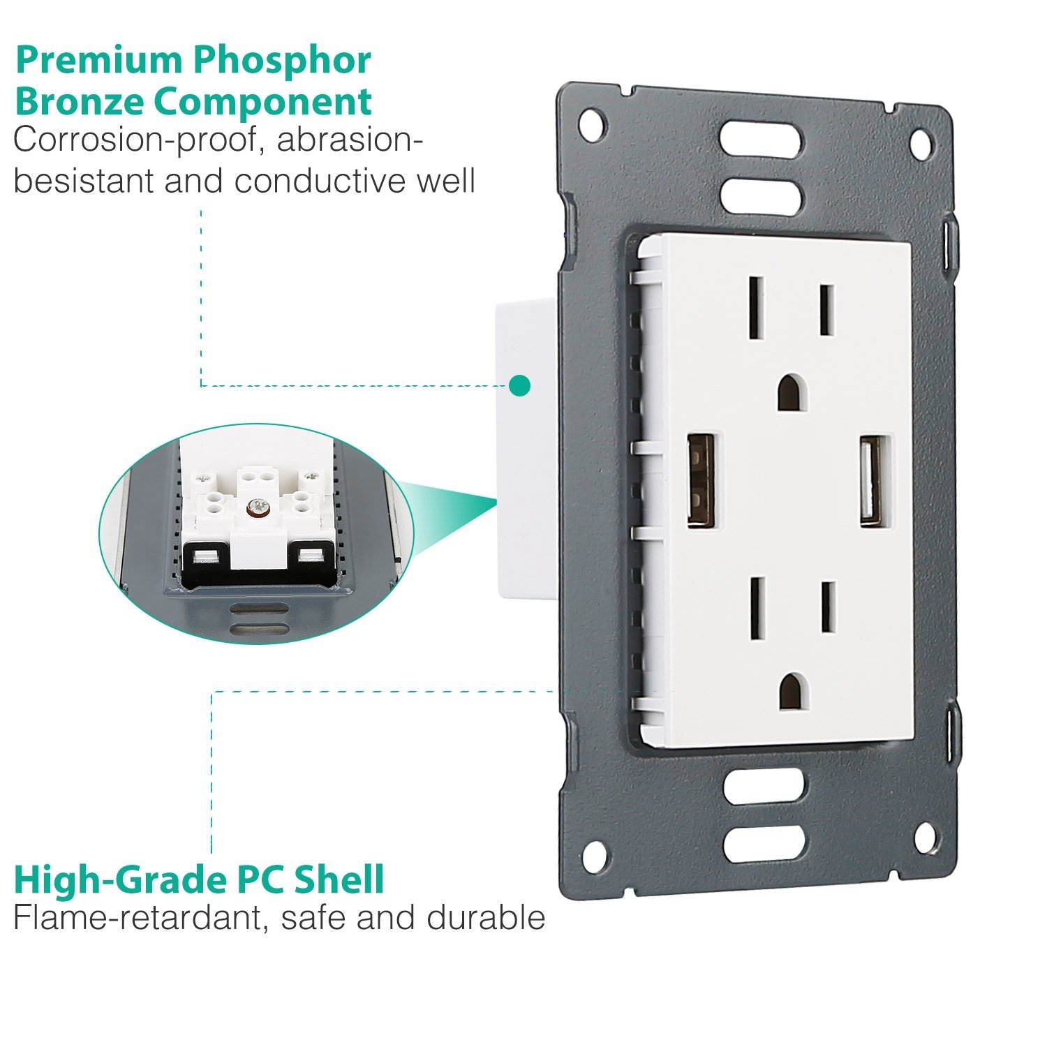 *Durable and Secure*:Adopting flame-retardant PC and premium phosphor bronze material,our USB wall outlet supports overvoltage and overcurrent protection,durable and safe.