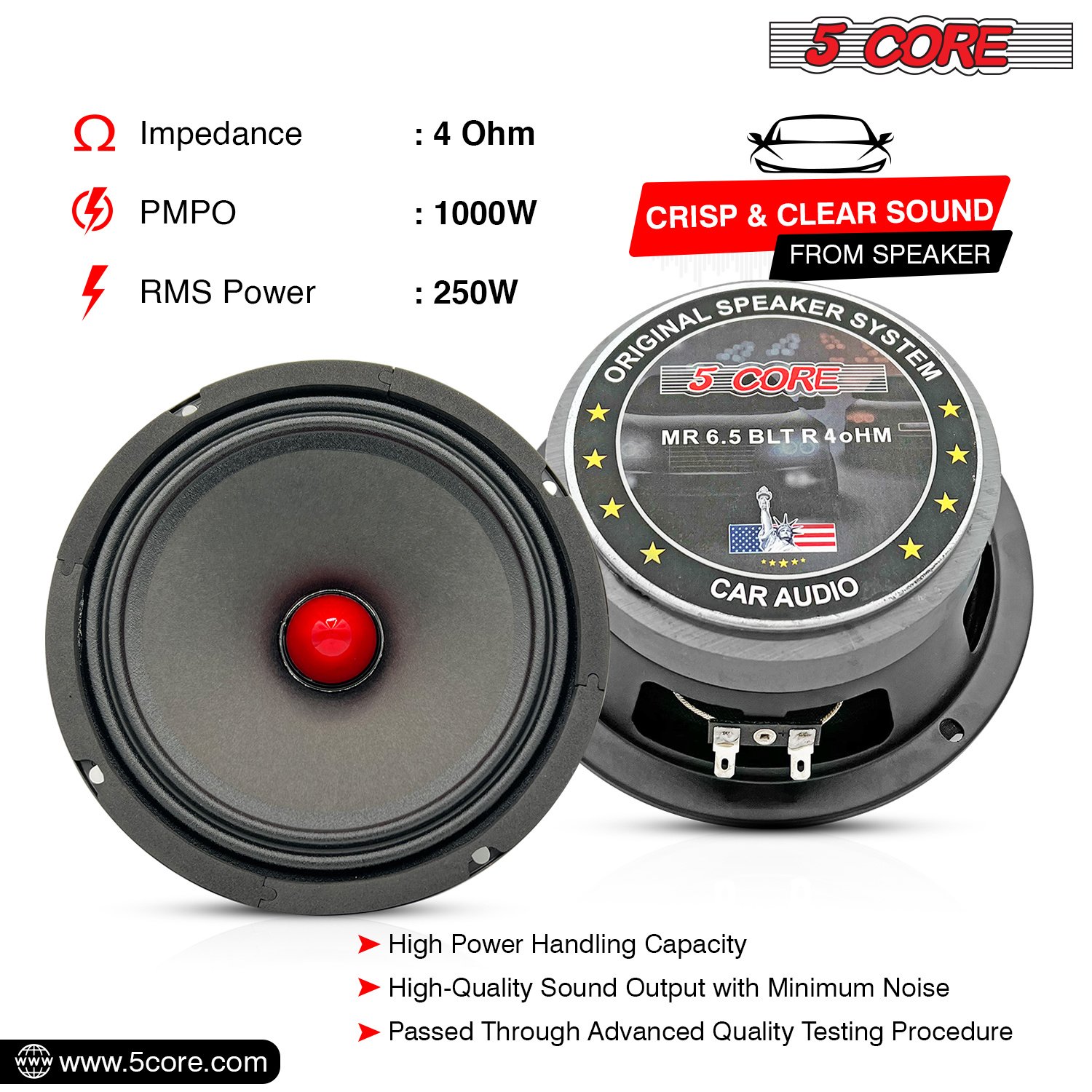 Introducing the 5 Core 6.5 car speakers, the perfect audio solution for car stereo or audio enthusiasts. With a 30 oz magnet, this subwoofer produces powerful audio and unmatched performance. It boasts a peak power handling of 1000 Watts and RMS 250W, with a voice coil 1.5-inch High-Temperature CCAW.