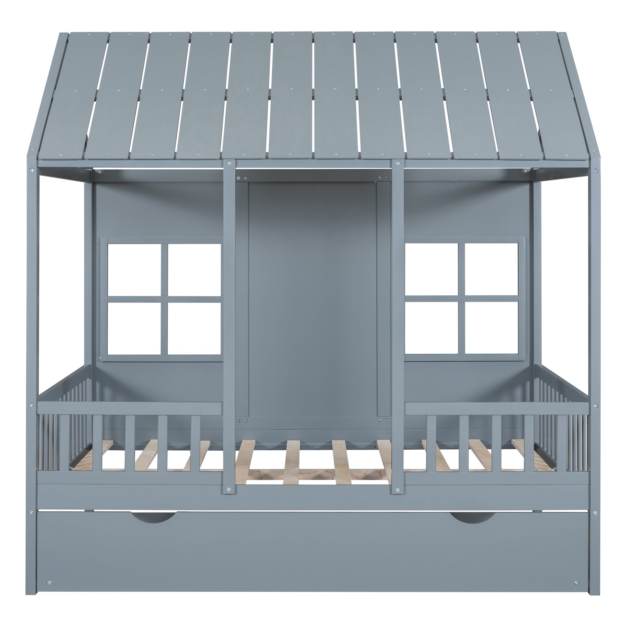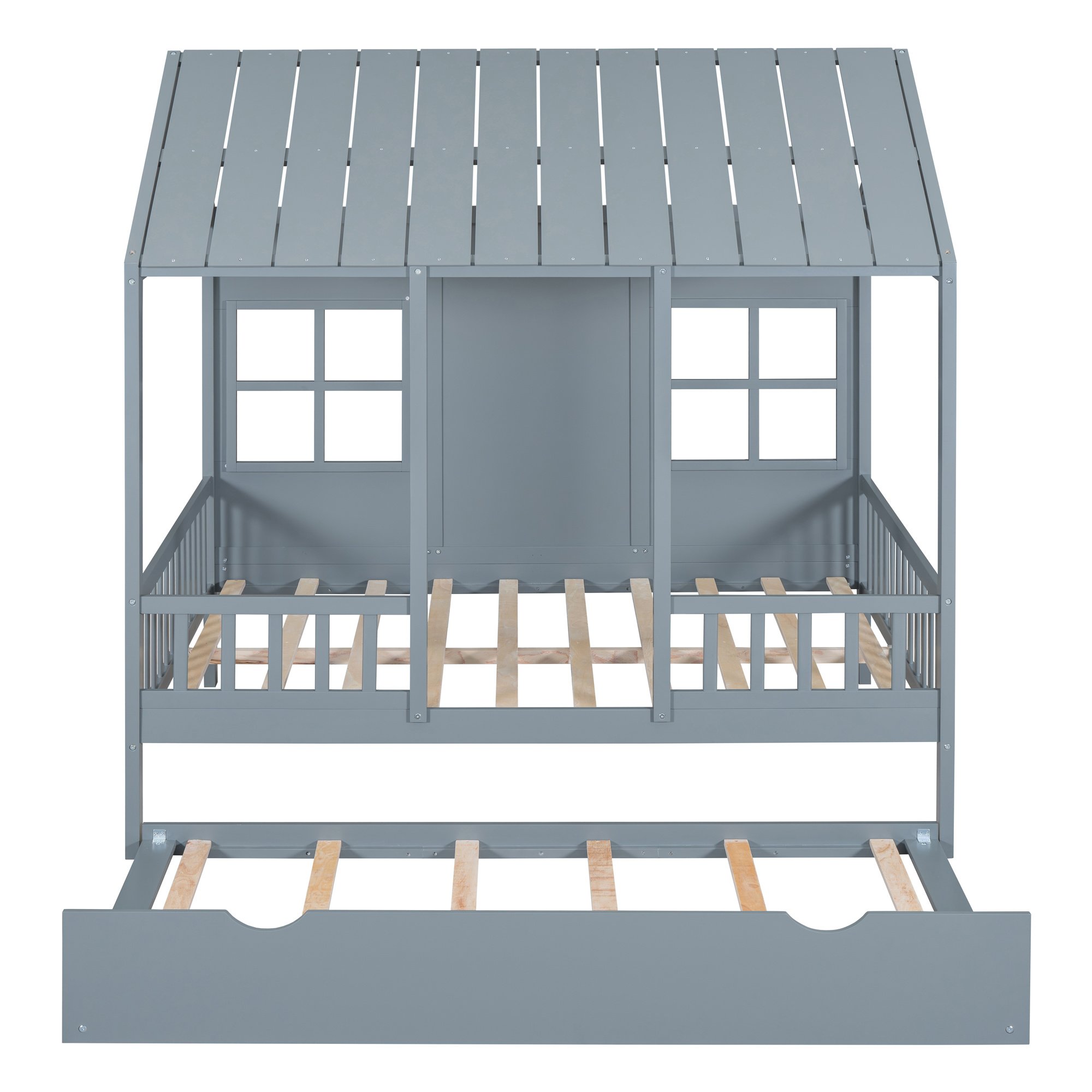 Full Size Wood House Bed With Twin Size Trundle, Wooden DaybedTake your children's bedroom to the next level with this Full Size House Bed with Twin Size Trundle that not only saves space, but creates an exciting atmosphere for your kids. Featuring a playhouse-inspired window, this bed doubles as a play place perfect for kids to study, watch TV or explore their imaginations. Enjoy this bed for years to come with its durable build, manufactured with quality lumber and pinewood to withstand horseplay, scratching and other untimely wear. Comes complete with thick slats to preserve the life of your mattress.