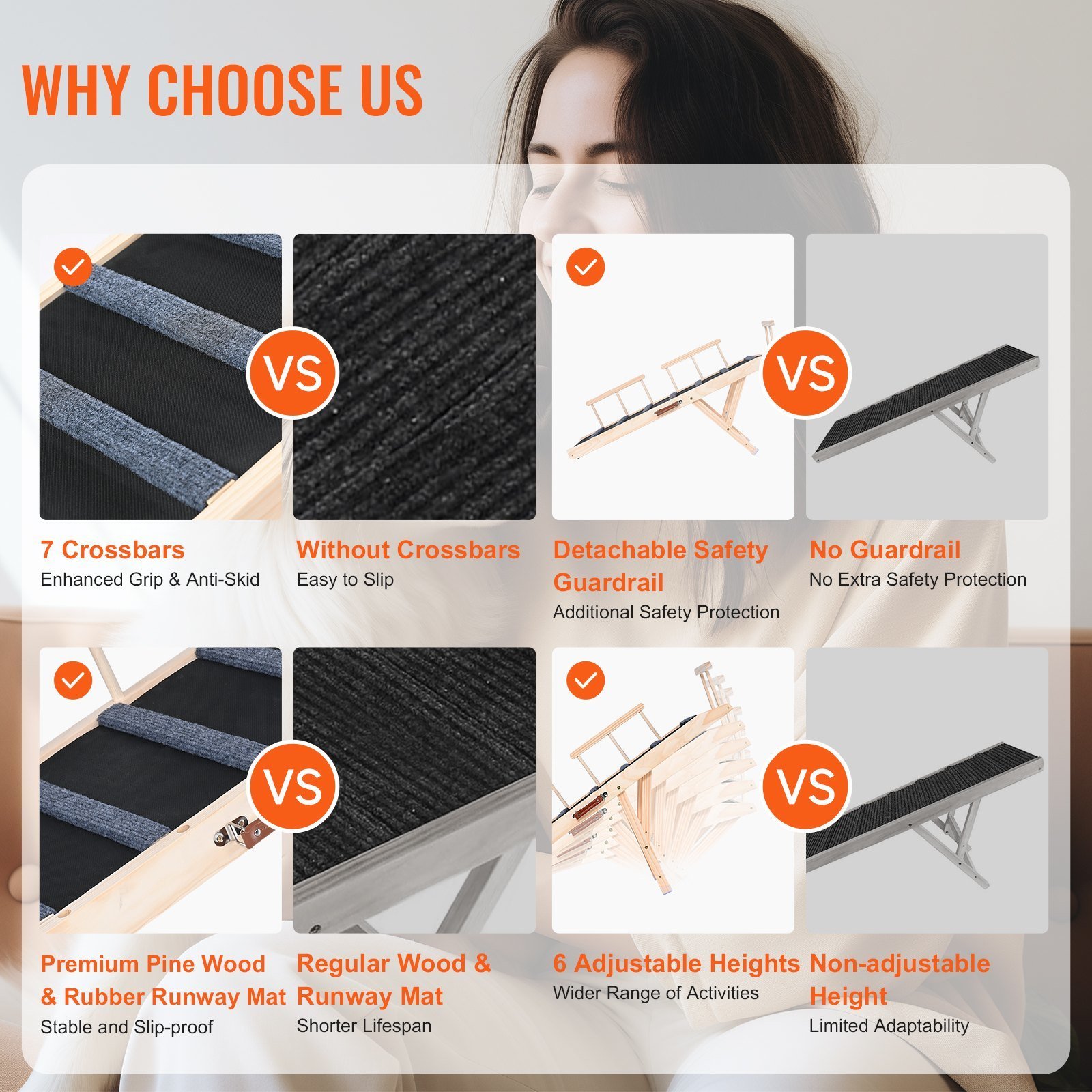1.High Traction & Non-Slip Surface: The dog ramp features a high-traction rubber carpet with grooves, providing your pet with a secure and non-slip surface. The ramp's design includes 7 crossbars that offer added grip to prevent slipping and falling during climbs.