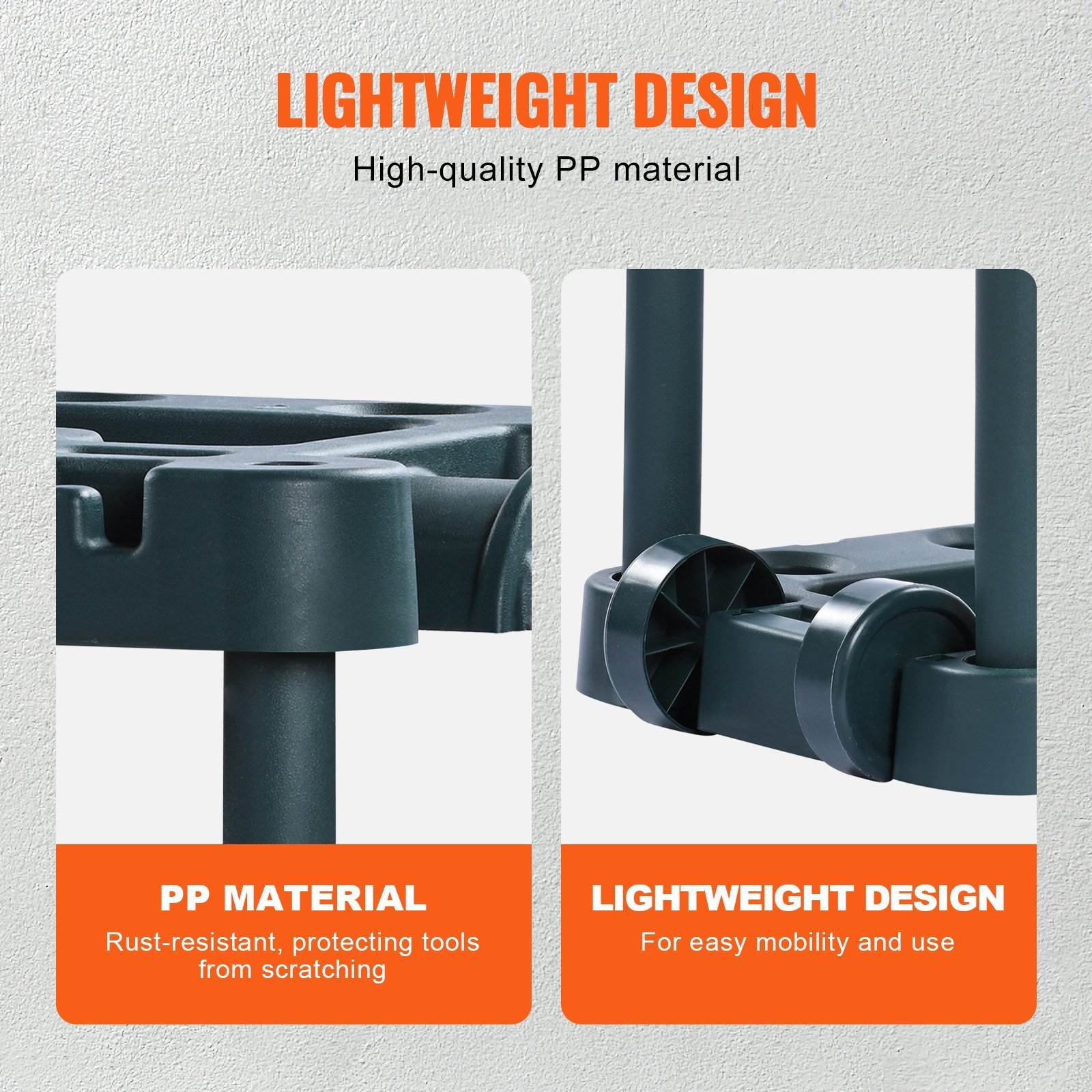 2.Built to Last: Crafted from top-quality PP (Polypropylene) material, this lawn tool organizer is tough against the elements and wear. It weighs just 7.17 pounds (3.25 kg) with all parts included. The sturdy vertical pipes enhance stability and load-bearing capacity, making it easy to move while staying rock-solid.