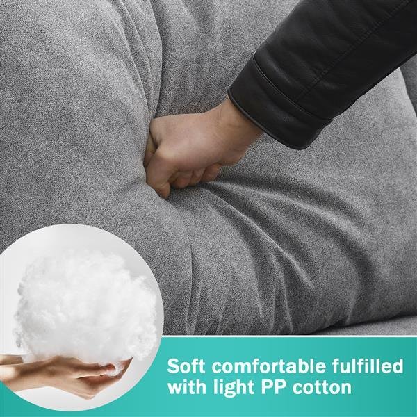 Product DescriptionFor a living room with style, comfort and spacious seating, the 3-piece sectional sofa will satisfy your needs. This sectional features gray upholstery that's both versatile and trendy. And, when it comes to comfort, delivers with its huge seating area and extra accent pillows. With all these great features, you're in for a well-balanced room with character.FeaturesProduct TypeSofaProducts includedLeft-Arm-Facing Loveseat;Right-Arm-Facing Loveseat;WedgeSeating Capacity5Upholstery Material100% polyesterFrame MaterialSolid + Manufactured WoodLeg MaterialPlasticSeat Fill MaterialFoam; Pocket springBack Fill MaterialPolyesterRemovable CushionsYes.Seat,backrestReversible CushionsYes.Seat,backrestPillows IncludedYes,3 includedProduct CareLightly brush or vacuum frequently to remove dust and grime. Spot clean using a mild water-based solvent. Pre-test cleaning methods on a hidden surface. A professional cleaning service is recommended for an overall soiled condition.Arm TypeShelter ArmSeat StyleMultiple cushion seatBack TypeSemi-Attached PillowsSupplier Intended and Approved UseResidential UseCountry of OriginChinaAdult Assembly RequiredYes,Suggested of 2 PeopleAdditional Tools RequiredTools includedProduct DimensionsOverall91*91*33.5"(L*D*H)Loveseat dimensions57*28.5"(L*D)Back Height - Seat to Top of Back16.5"Arm Height - Floor to Arm25.3"Seat Height- Floor to Seat16.9"Leg Height - Top to Bottom3.9"Cushion thickness6"Pillow size14.5*14.5"Weight Capacity300lbs / seatNoticeThe packaging of the product package may be updated at any time, please refer to the actual product received.All colors on our website are for reference only, actual product colors may vary a little bit, due to different colour settings of every screen device.Please note: most of our sofas are hand-measured, therefore the dimensions are for reference only, and may marginally deviate.The cushions are vacuum-packed. After opening the package, please allow 72 hours to let it come back to its original shape.Keep it looking its best√ Blot spills immediately with a clean, absorbent white cloth.√ For indoor use only.√ Avoid direct sunlight.√ Do not leave newspaper or other printed material lying on surface.√ Dimensions of bench-made upholstery may vary slightly.√ Vacuum regularly.√ Spot clean using distilled water and water-based cleaning agents, foam or mild water-free cleaning solvents.√ Always test a small inconspicuous area first.Sectional Sofa Pieces: This sectional features gray upholstery that's both versatile and trendy. Includes left-arm-facing loveseat, wedge and right-arm-facing loveseat, 3 pillows are included in the package to meet various daily use needs.Comfortable design: Wide track armrests, cushions and legs for a clean, modern aesthetic. Comfortable foam, pocketed spring-filled pads supported by a curved spring structure. Heavy-duty S-shaped lines span the frame from front to back, providing even comfort and support throughout the seating area, preventing sagging.1 % Polyester upholstery: This easy-care fabric boasts a soft feel, yet it's tough enough for extensive, everyday use.High-quality Solid Wood: Frame joints are reinforced with corner blocks and heavy-duty metal fasteners for added strength and stability.Easy to Assemble: This L-shape sofa needs to be assembled, instructions manual and tool included, Overall size: 91"(L)* 91"(W)"* 33.5"(H).In order to facilitate the assemble, we use the plastic legs and strong semi-attached cushions to avoid too many accessories to install.Package: This sofa will be shipped from the US in a total of 5 packs.